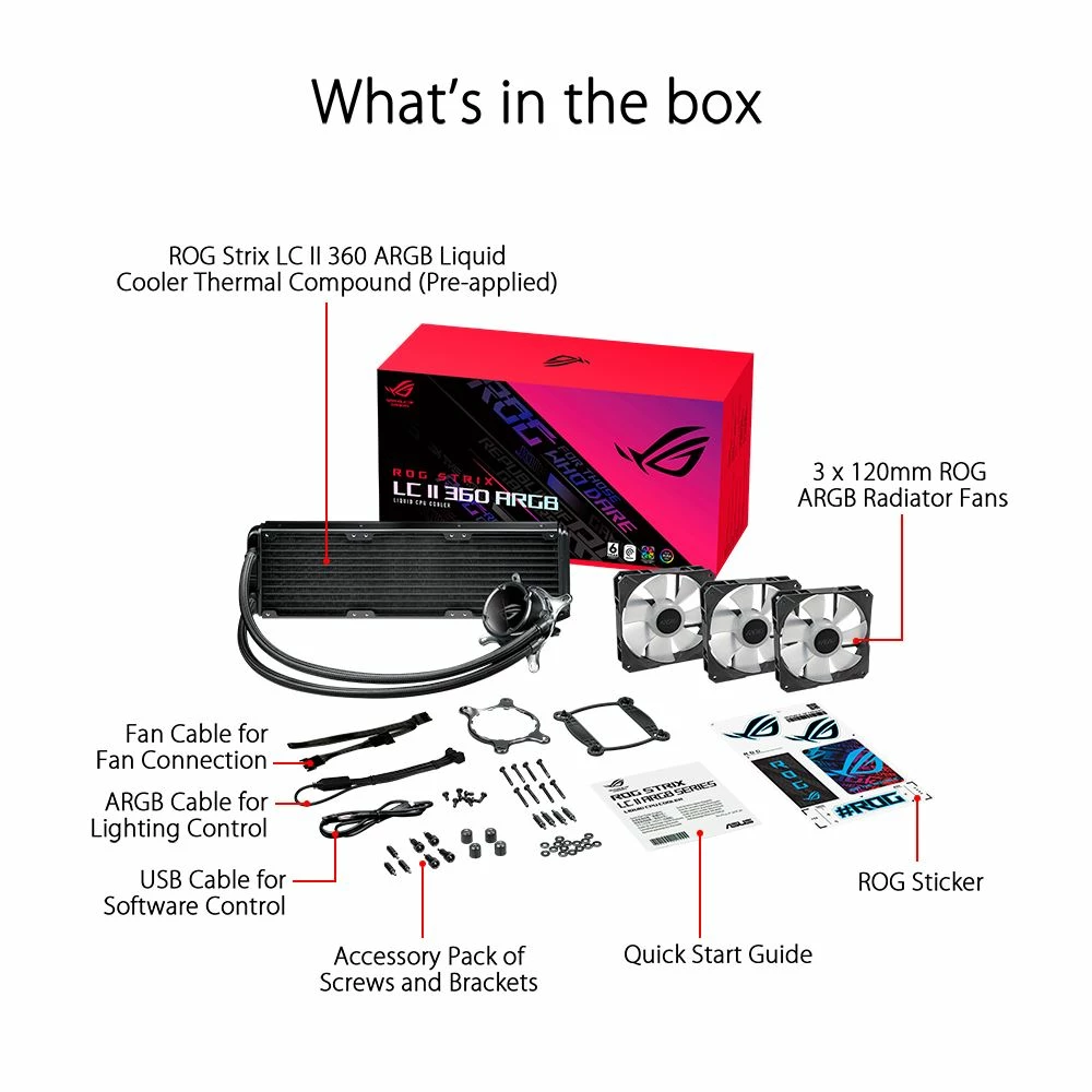 ASUS ROG Strix LC II 360 ARGB is the perfect solution for RGB enthusiasts and delivers high-performance CPU liquid cooling with clean aesthetics. Featuring a closed-loop design and addressable RGB radiator fans, unleashes the full potential of your unlocked Intel or AMD CPU, while further accentuating your build with brilliant multi-color lighting effects.