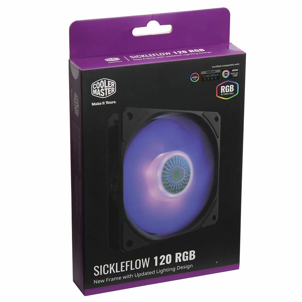 SickleFlow 120 RGB, a new series of the CoolerMaster Fan family, provides a specific air cooling solution ideal for CPU coolers and chassis in-take fans. Optimized blade design with updated curve that improves air flow and air pressure. Enhanced frame structure, reducing turbulent flow and noise and increasing overall work efficiency. Sealed and secured fan bearing, preventing dust and lubricating oil leakage while increasing the fans operation stability and life span.