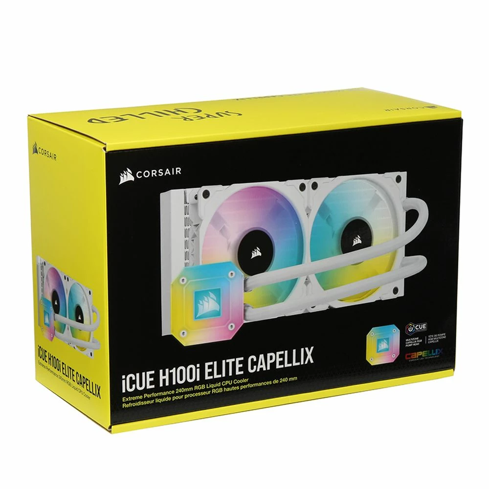 The CORSAIR iCUE H100i ELITE CAPELLIX Liquid CPU Cooler delivers powerful, low-noise cooling for your CPU, with a 240mm radiator, two CORSAIR ML120 RGB PWM fans, and an ultra-bright CAPELLIX RGB pump head.