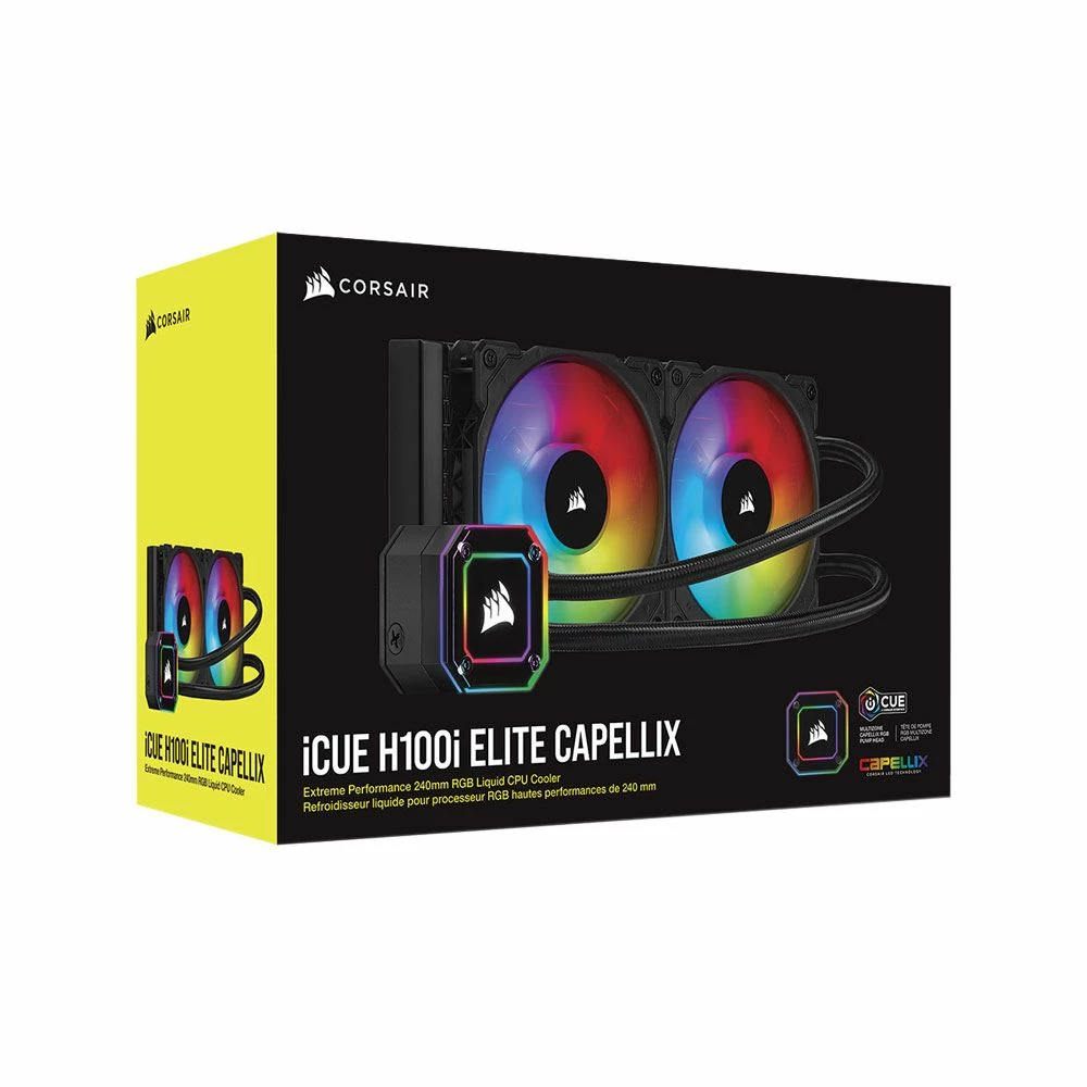 The CORSAIR iCUE H100i ELITE CAPELLIX Liquid CPU Cooler delivers powerful, low-noise cooling for your CPU, with a 240mm radiator, two CORSAIR ML120 RGB PWM fans, and an ultra-bright CAPELLIX RGB pump head.