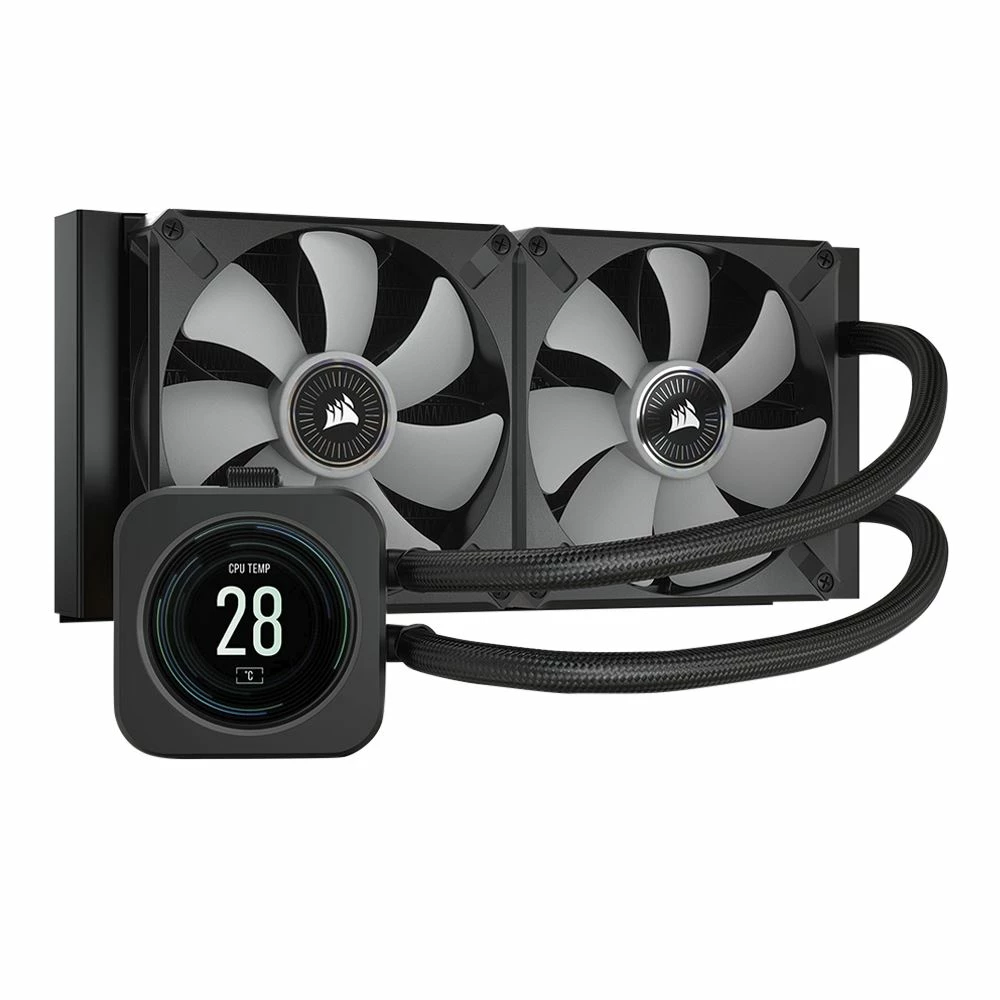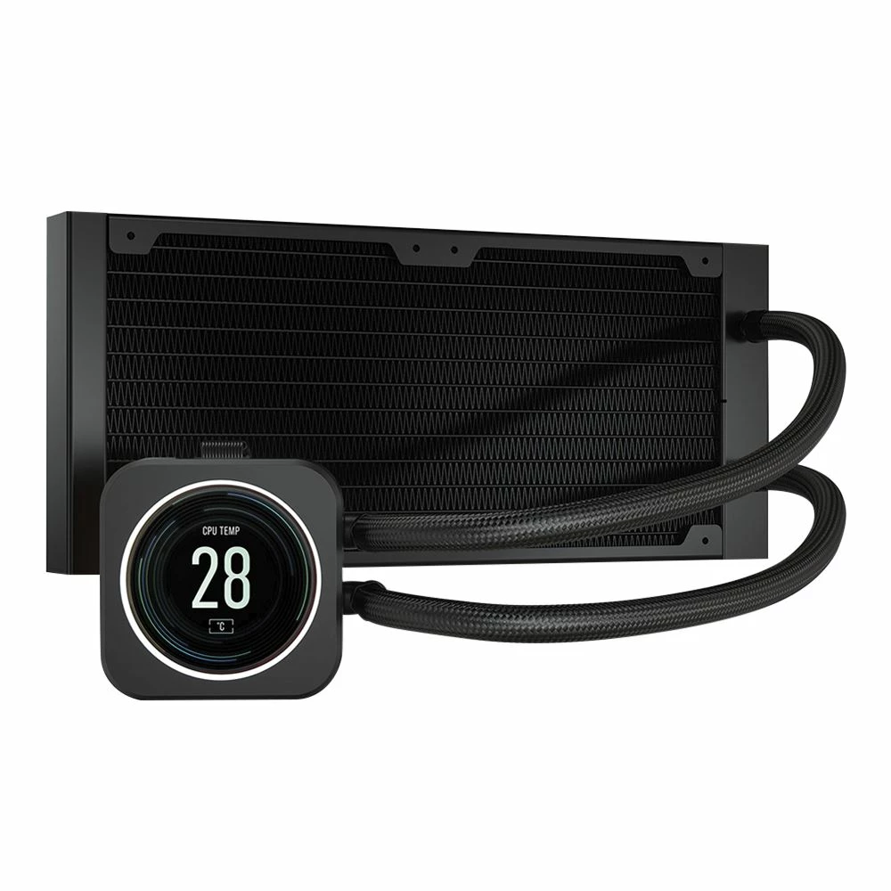 The CORSAIR iCUE H100i ELITE LCD Display Liquid CPU Cooler delivers powerful, customized cooling for your CPU, with a personalized LCD screen that displays GIFs, images, and system information. Two cutting-edge CORSAIR ML120 RGB ELITE PWM fans controllable between 450 – 2,000 RPM and 40 total RGB LEDs add extreme low-noise cooling performance and vibrant lighting effects. Connect to the included CORSAIR iCUE COMMANDER CORE and powerful CORSAIR iCUE software to orchestrate synchronized RGB lighting, adjust fan speeds, and enable Zero RPM mode on up to six fans. iCUE also controls LCD screen customization, enabling you to choose between a diverse library of graphical themes. With a 240mm radiator, thermally optimized copper cold plate, and easy installation on the latest CPU brackets, the H100i ELITE LCD puts your CPU cooling on full display.