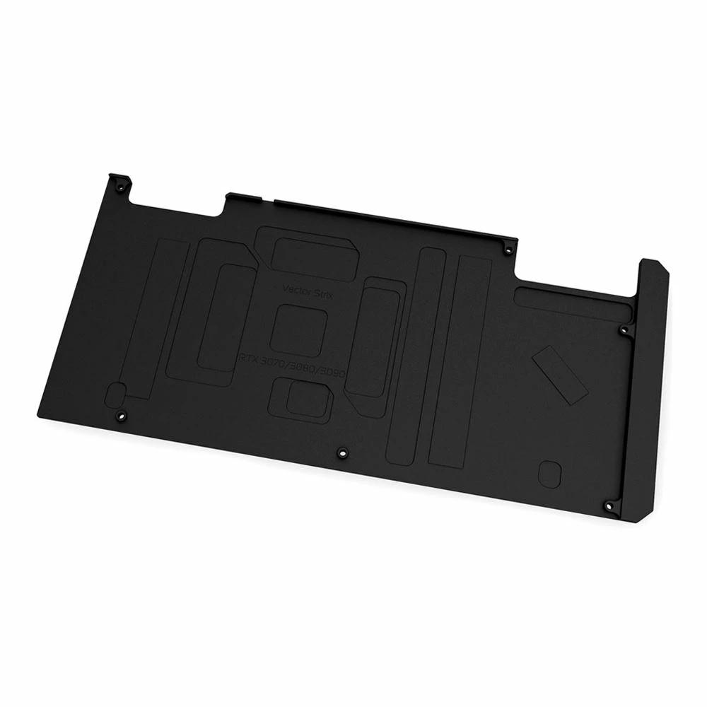 EK-Quantum Vector Strix RTX 3080/3090 Backplate – Black is a CNC machined retention backplate made from black anodized aluminum, that fits all EK-Quantum Vector Strix RTX 3080/3090 water blocks. The backplate covers the whole length of the graphics cards PCB, serves as an aesthetic add-on, and also provides passive cooling for the backside of the voltage regulation module (VRM), the GPU core, and VRAM on the 3090 cards.
