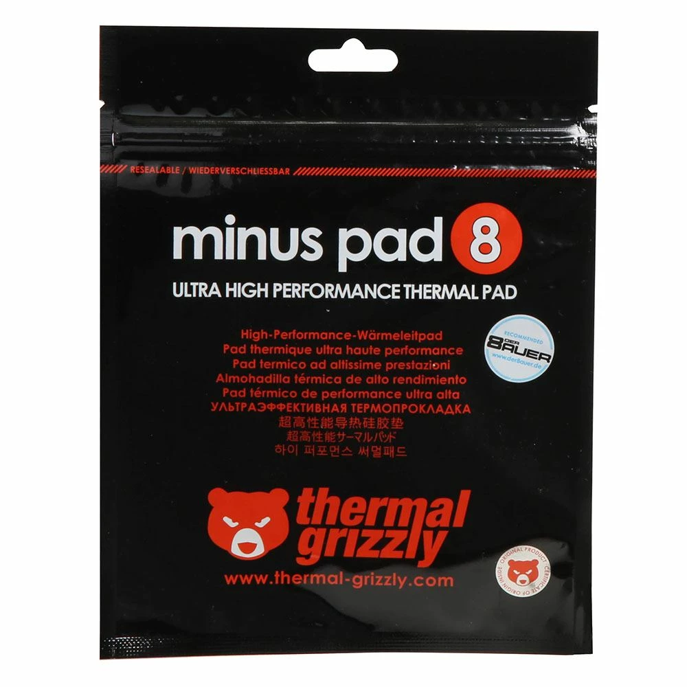 The high performance thermal pads of the Thermal Grizzly Minus Pad 8 series consist of a very elastic and flexible surface area with very high thermal conductivity, compensating for even the smallest of gaps between components. Available in a variety of different sizes and thicknesses.