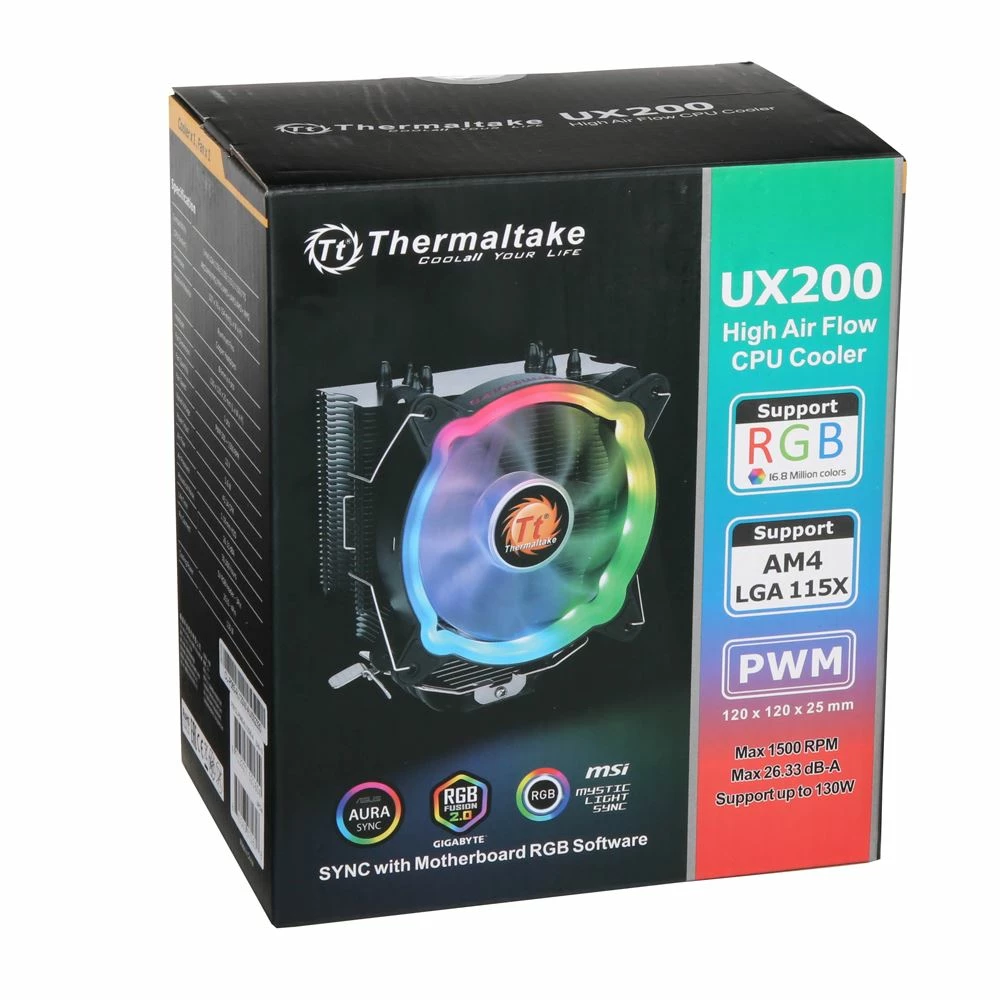 Armed with high air flow blades, U-shaped copper heatpipes and aluminum heatsink, the Thermaltake UX200 keeps your CPU cool under intensive workloads. Addressable LEDs around the fan frame support 16.8 million colors and deliver dynamic lighting effects that can be synchronized with motherboard software. The included mounting kit makes for hassle-free installation with mainstream Intel and AMD sockets.